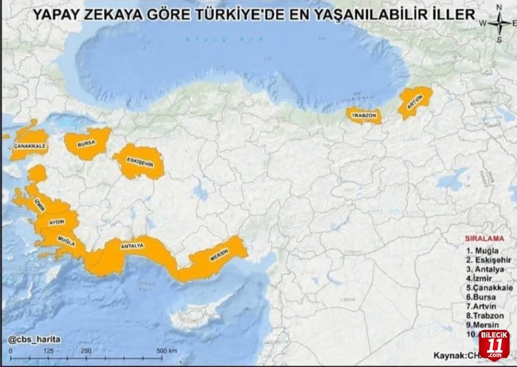 Yapay zekaya göre Türkiye’nin en yaşanılabilir 10 ili doğası, iklimi, yaşam kalitesi, sakinliği, ulaşım imkânları ve kültürel zenginliklerine göre şöyle olurdu: