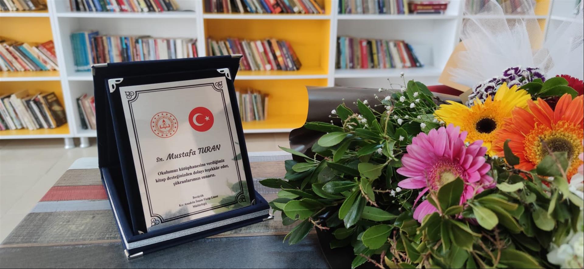 Kütüphanemizin hazırlanmasında emeği olan kıymetli yazar Mustafa Turan hocamıza, Bozüyük Kaymakamımıza, Milli Eğitim Müdürümüze, İl Müftüsü Ali Erhun hocamıza, kurum yetkililerimize, kütüphane yetkili ve personelimize, katılan öğrencilerimize teşekkür ediyoruz.” ifadelerini kullandı.