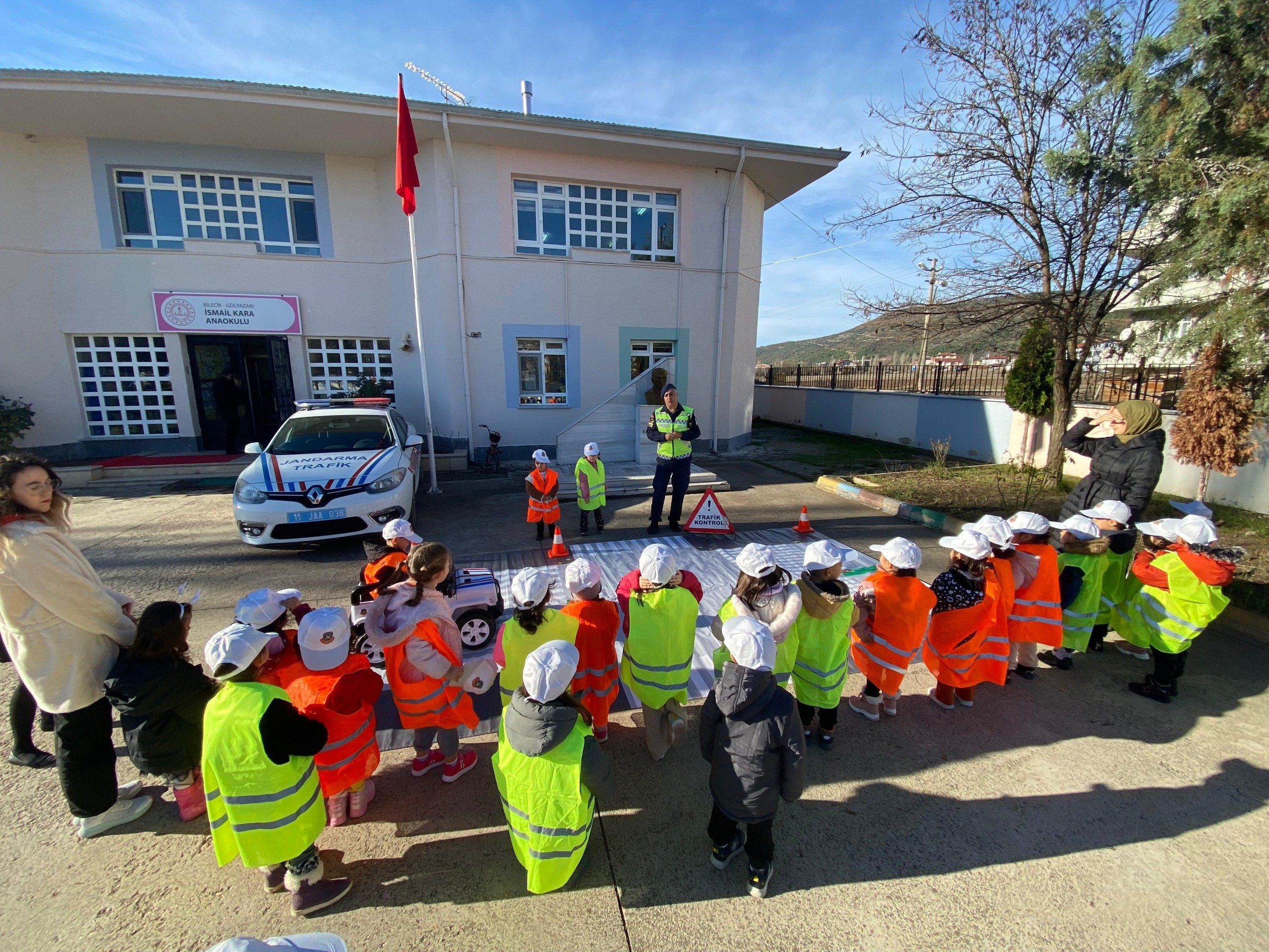 Bilecik’in Gölpazarı ilçesinde İsmail Kara Anaokulundaki öğretmen ve öğrencilere İlçe Kaymakamı Alparslan Sözen ve ilçe Milli Eğitim Müdürünün de katıldıkları Trafik ışık ve işaretleri, Emniyet kemeri kullanımı konularında eğitim verildi.