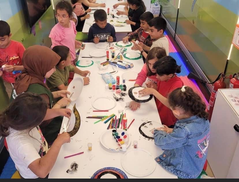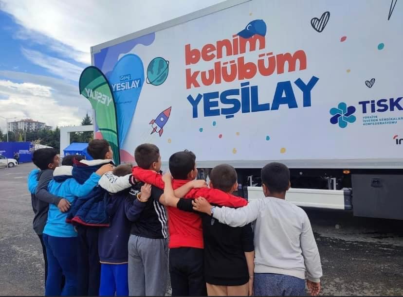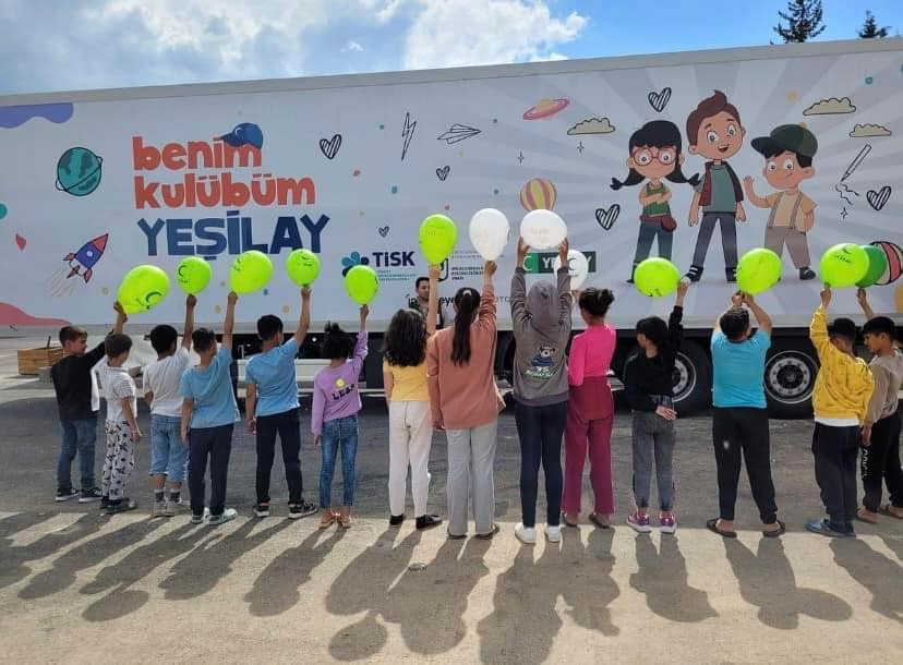 Deprem Bölgesinde ''Benim Kulübüm Yeşilay Psikososyal Destek Tırı''nda çocuklar birlikte hem eğleniyor hem de öğreniyor.