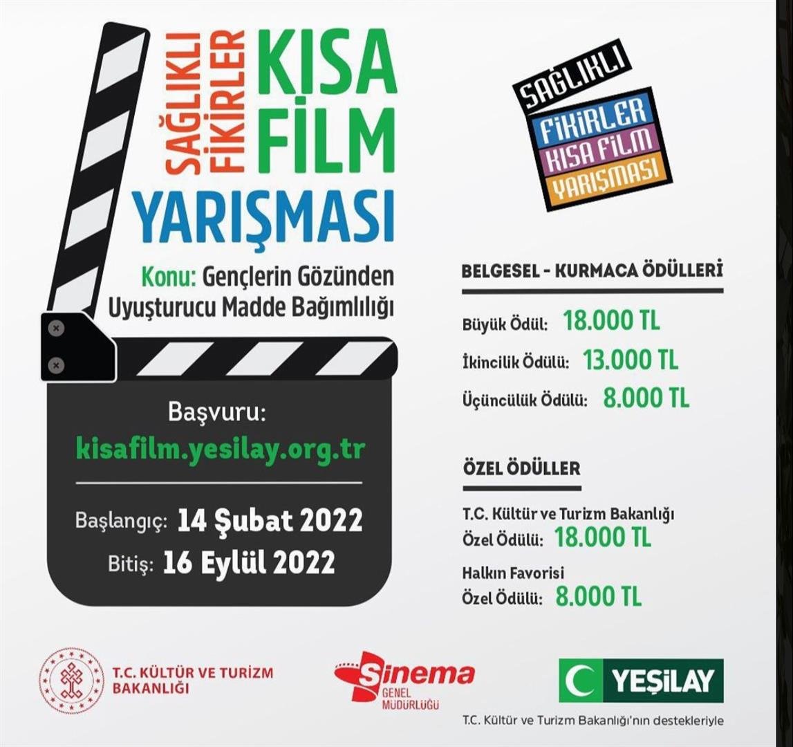 Yeşilay’ın bu yıl 6’ncı kez düzenlediği Sağlıklı Fikirler Kısa Film Yarışması için başvurular başladı. T.C. Kültür ve Turizm Bakanlığı’nın katkılarıyla gerçekleştirilen yarışmanın teması “Gençlerin Gözünden Uyuşturucu Madde Bağımlılığı” olarak belirlendi. Yarışmaya, Türkiye genelinde lisans ve yüksek lisans düzeyinde örgün eğitim gören tüm öğrenciler, kurmaca veya belgesel türünde eserleriyle katılabiliyor. Başvurular 16 Eylül 2022 tarihine kadar kisafilm.yesilay.org.tr web adresinden devam ediyor.