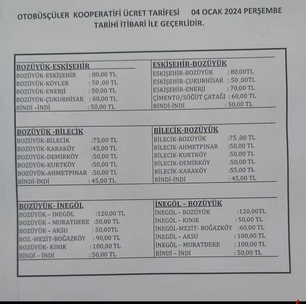 Geçtiğimiz günlerde Bilecik- Osmaneli arası yeni zamlı tarife yayınlanırken, bu sefer de Bilecik-Bozüyük arasında toplu taşıma yapan midibüslerin zamlı ücret tarifesi yayınlandı.