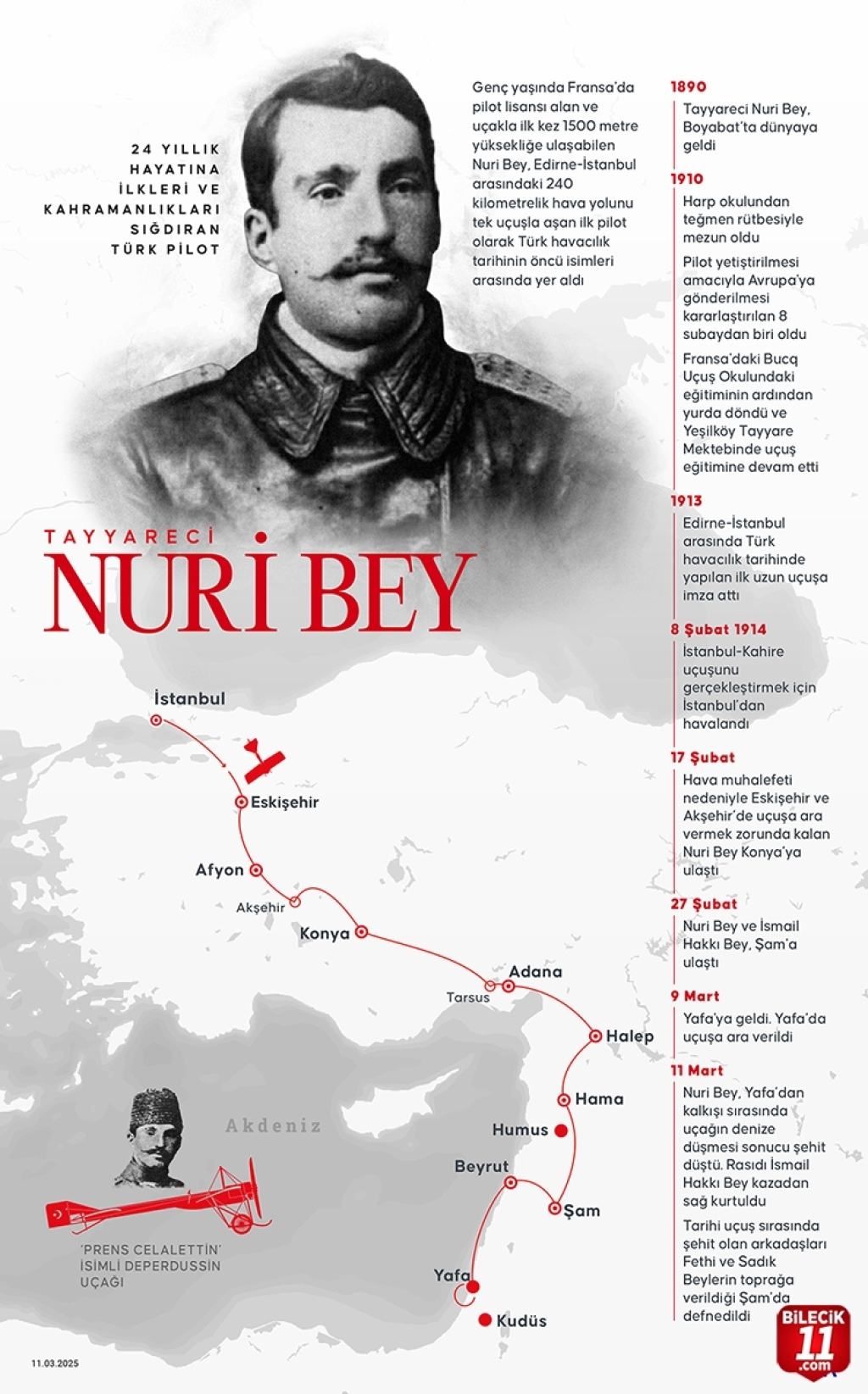 Türk havacılık tarihinin öncü isimlerinden Tayyareci Nuri Bey’in İstanbul-Kahire uçuşunu gerçekleştirirken uçağın ters rüzgar sebebiyle denize düşmesi sonucu şehit olmasının üzerinden 111 yıl geçti.