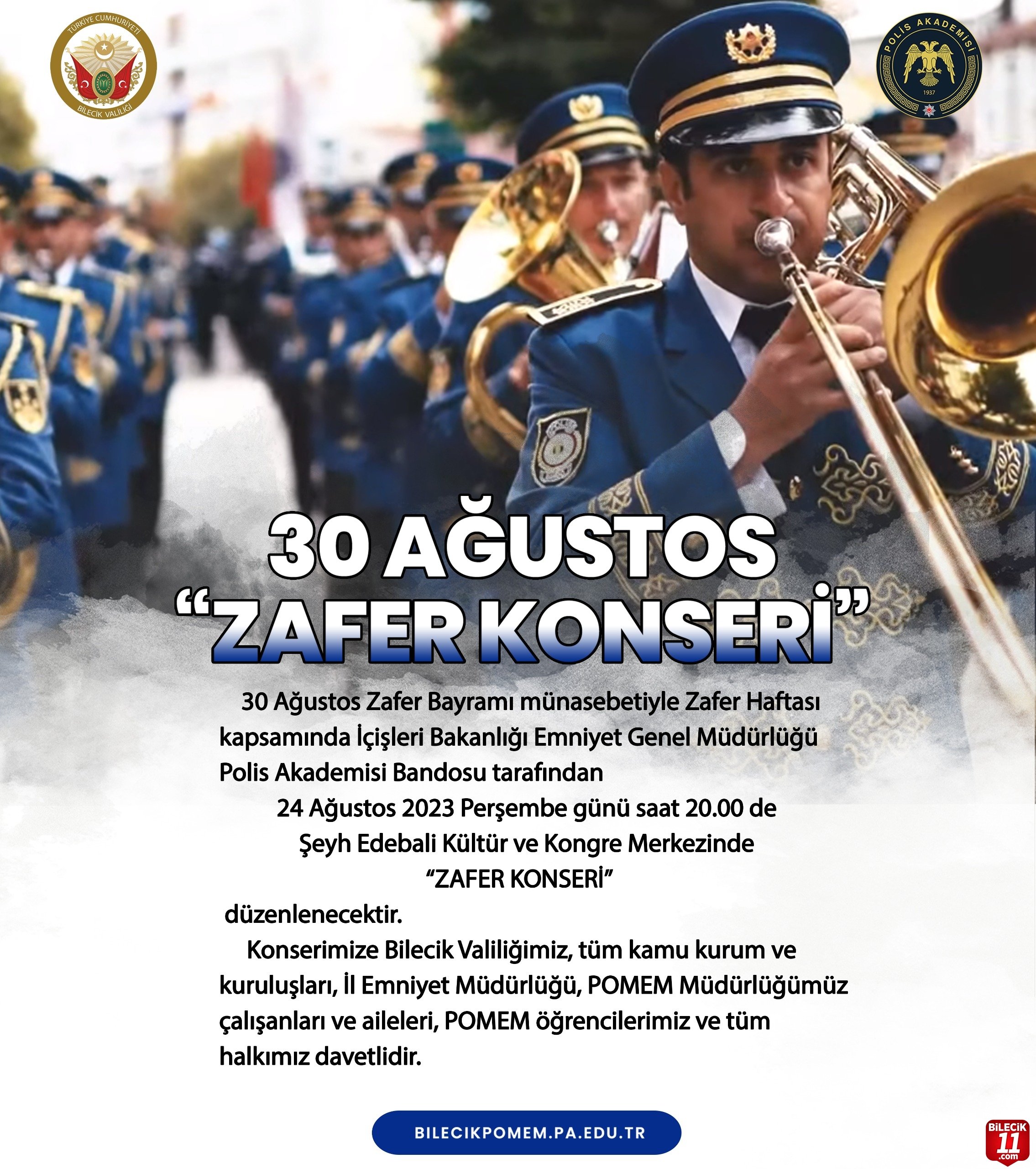 Bilecik Valiliği ve Emniyet Genel Müdürlüğü Polis Akademisi Bandosu tarafından gerçekleştirilecek.
