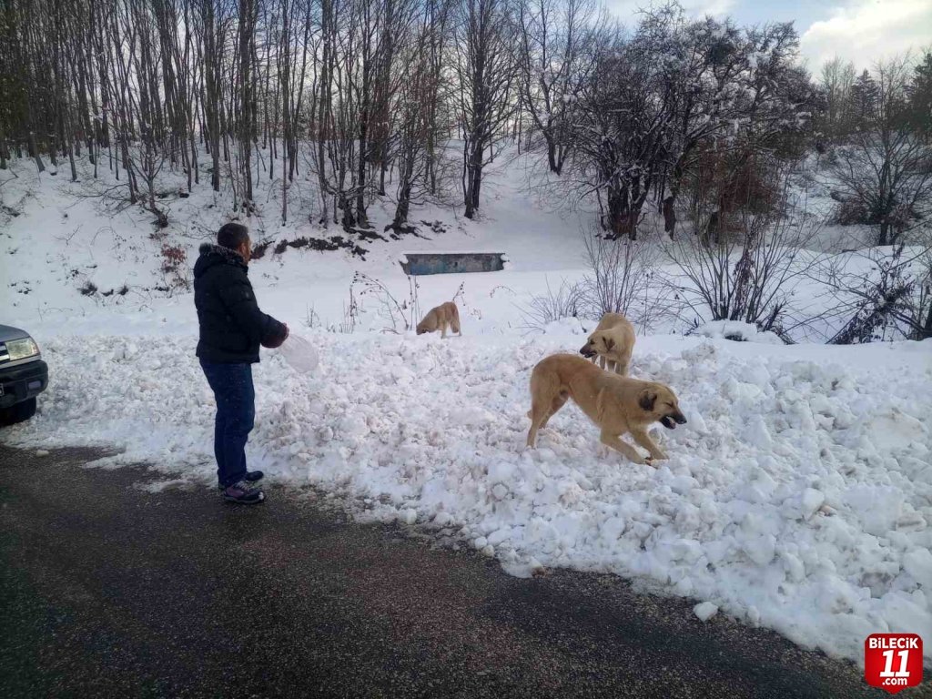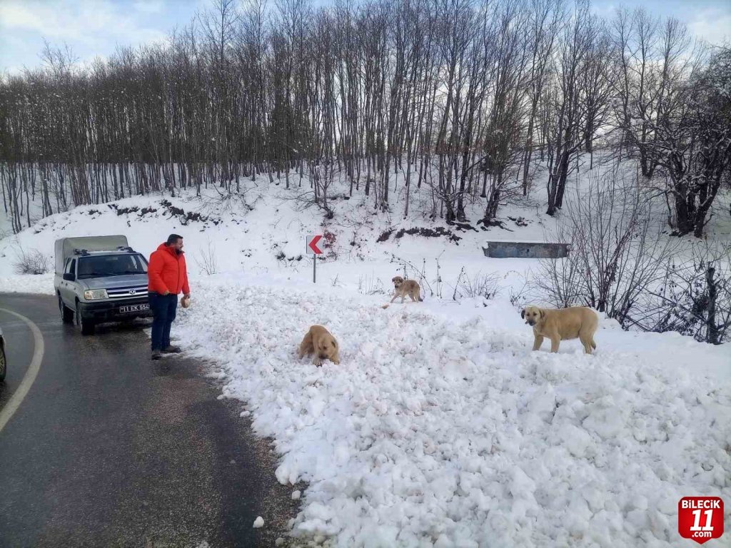 Pazaryeri’ni Bursa’ya bağlayan karayolunun Ahı Dağı kısmında sayıları gittikçe çoğalan sokak köpekleri belediye ekiplerince her gün periyodik olarak besleniyor.